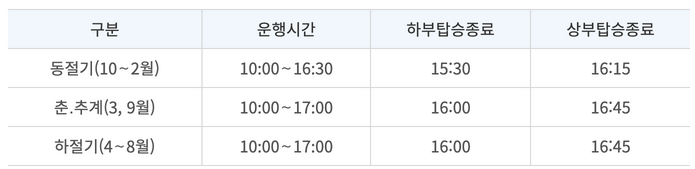 케이블카 운영시간은 동절기 및 하절기, 성수기, 춘계/추계 시즌별로 달라잡니다.